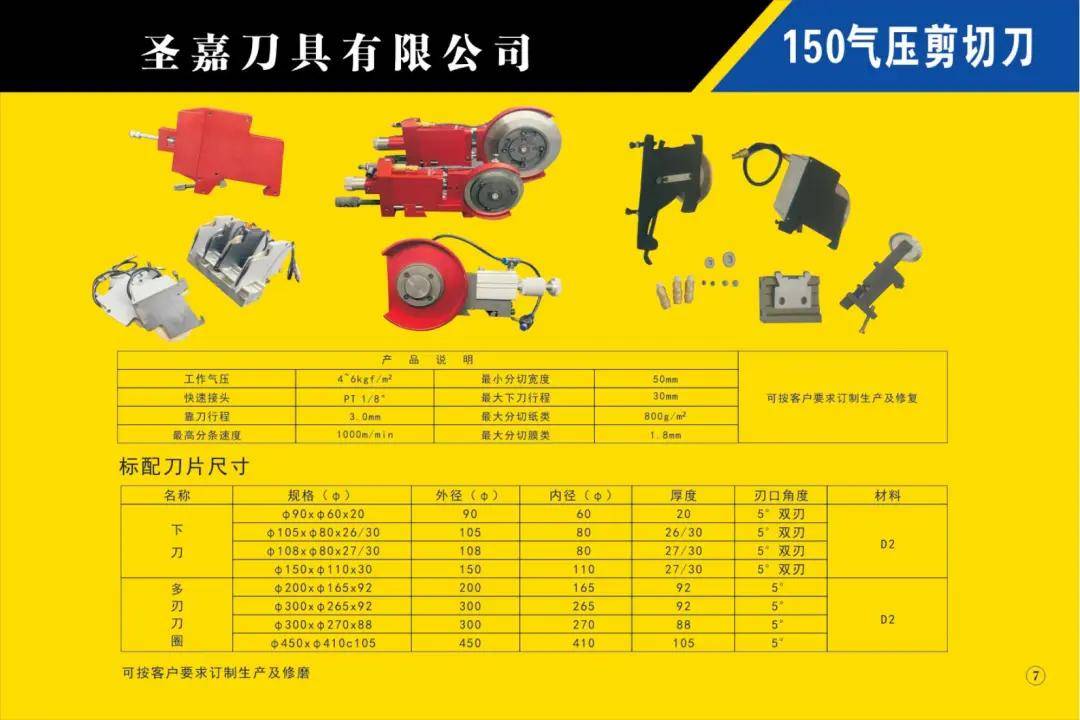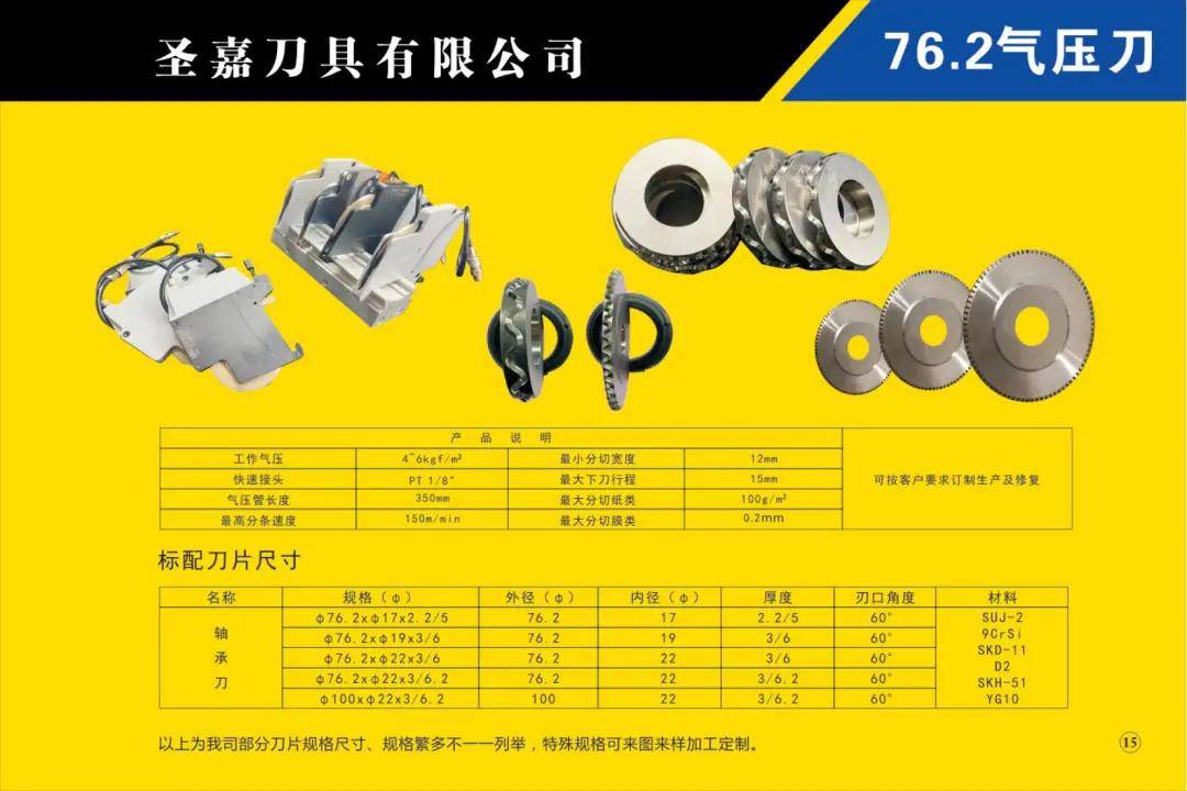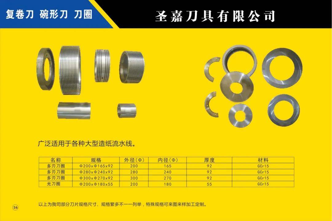 本公司所生產的各種型號規格分切、分條、分紙、復卷機圓刀片(蝶形上刀片、上刀架、下刀片、隔片、隔套、底棍、復卷刀、碗形刀、刀圈、大回旋圓切刀、砂輪、壓花輪、折疊刀、齒刀、異形刀)橫切刀、裁切刀、熱切刀、粉碎刀、切粒刀、撕碎刀、折頁刀、開槽刀、油墨刮刀、切臺圓刀、三孔刀、切管刀、氣壓刀組、剪切刀組、熱切刀組廣泛適用于造紙、紙制品加工、膠粘帶制品、薄膜、電線電纜、橡膠、輪胎、鋁箔、化纖、非織造布、復合包裝、卷煙、皮革、印刷、服飾輔料等行業。