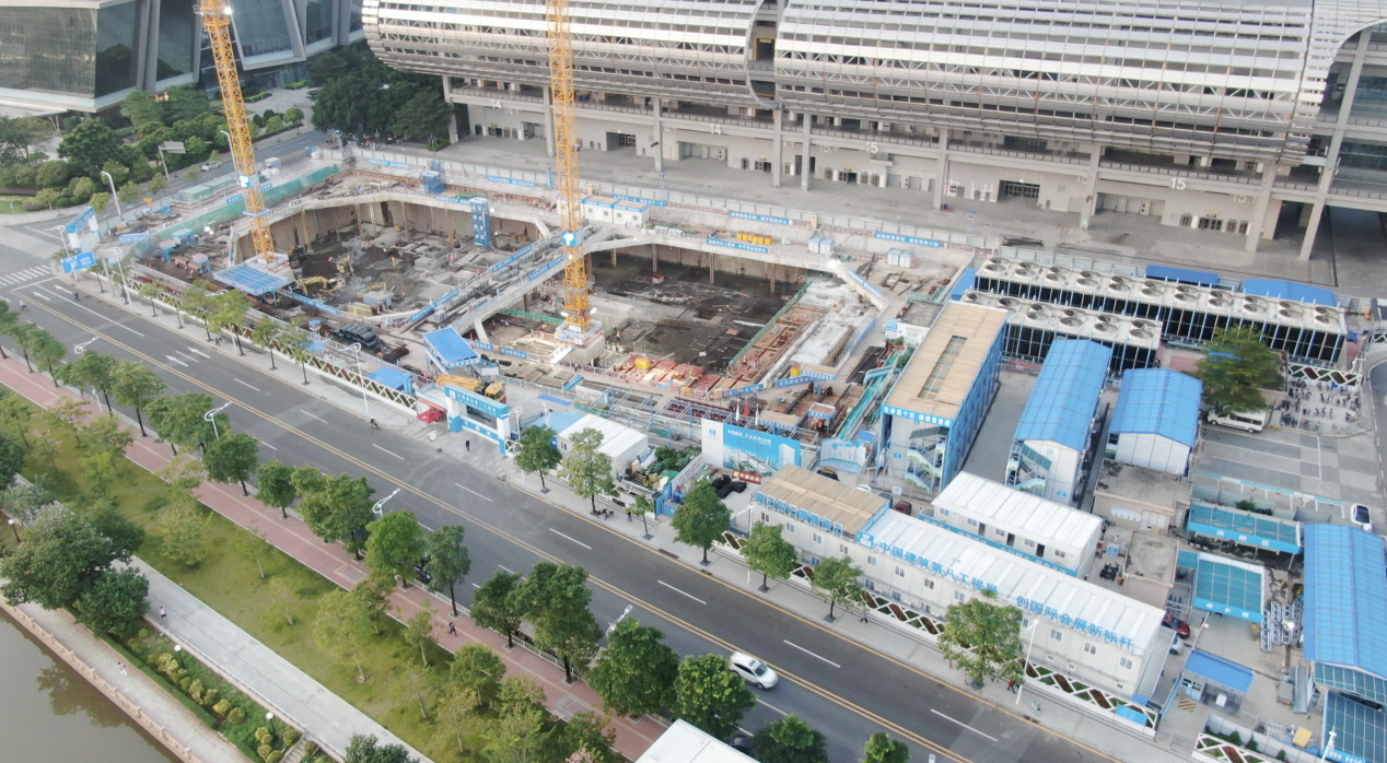 中建八局廣交會展館四期項目經理許本盈介紹,由于指揮中心基坑北側無限接近規劃紅線、東側與酒店地下室共用地連墻等原因,導致基坑施工過程無法形成環路,且南側和西側場地寬度僅有7至8米,占地面積十分狹小。